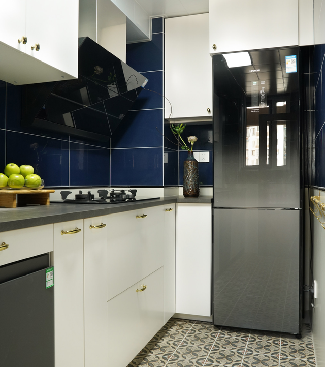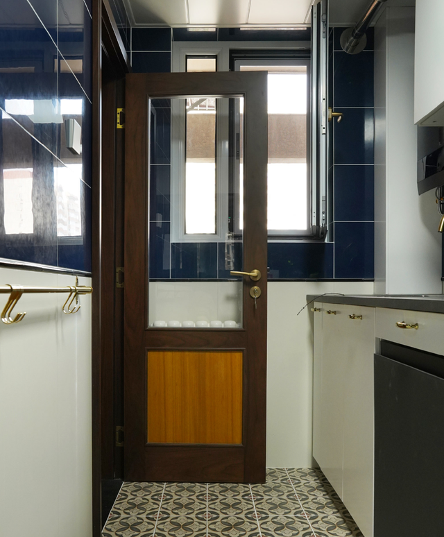 厨房里定制了一个平板玻璃门,可以避免小户型烹饪油烟的影响。墙面配以青花瓷砖,地面铺以拼花地砖,稳重而优雅。
