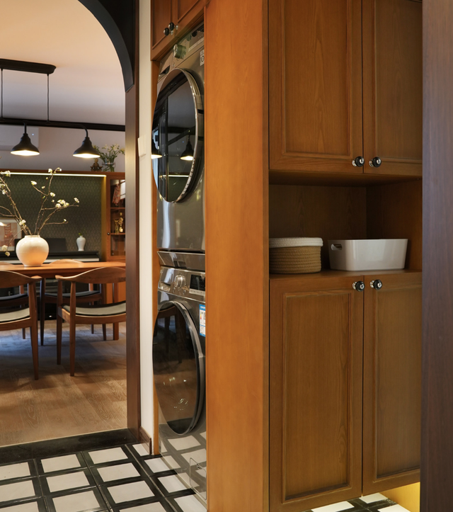 1. 卫生间的墙面被收拢,扩大了玄关空间,解决了家务和储物的需求。