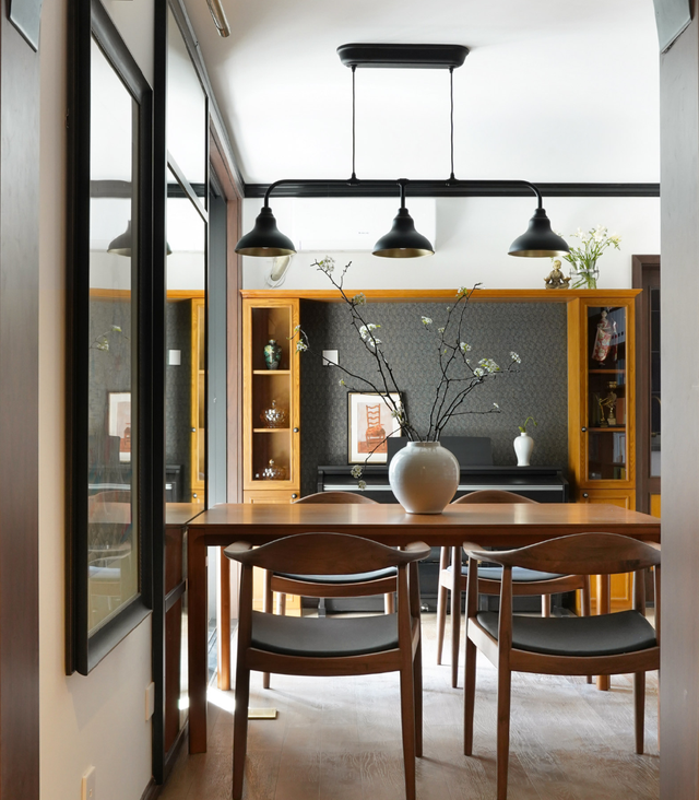 在餐桌墙面上定制一面墙镜,既能扩大空间感,又能立刻丰富空间层次。尤其是在灯光的背景下,更是映照出了多样化的风景。