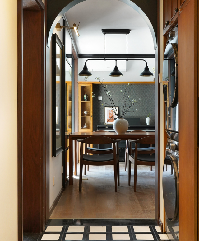 从客厅看向玄关,门口的哑巴开口是拱形的,就像一个窗口的景色,高端而美丽。