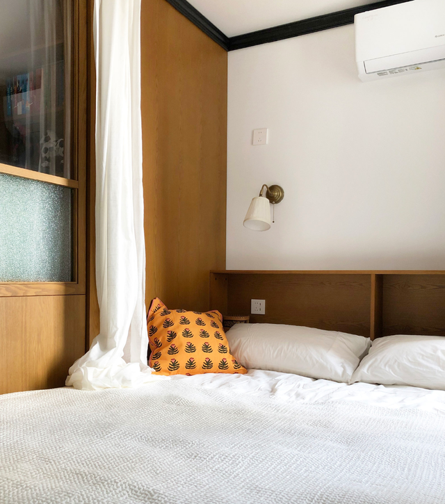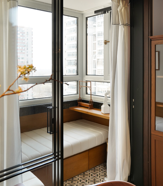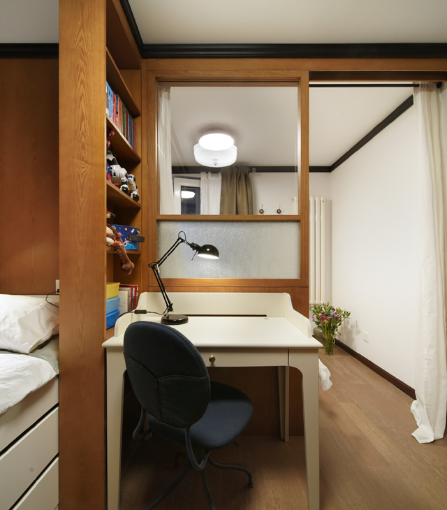 考虑到女儿只有寒暑假才会回来住,如果强行规划三间卧室,难免会出现无形的浪费。因此,阳台设计了转角榻榻米,不仅可以用来储物,还可以用来休闲。同时,80cm的宽度也充分满足了睡眠的需要。