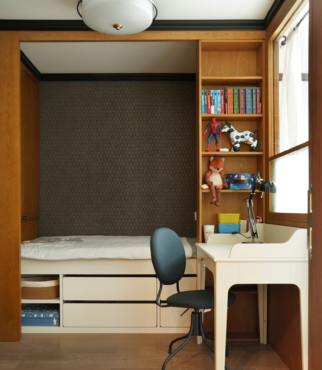 定制的高箱床底部有三个大抽屉,储物能力非常强。深绿色的壁纸贴在睡眠区的墙上,也给了孩子足够的睡眠沉浸感。