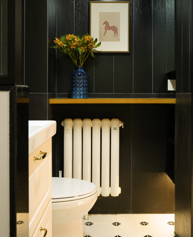 在空间没有灯光的情况下,墙面铺设黑色瓷砖似乎是一个不合理的选择,但在不同材质、颜色和灯光的衬托下,也营造出别致优雅的氛围。