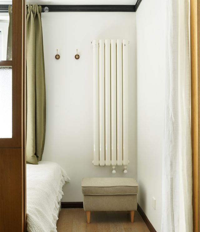 主卧室受空间面积的限制,只配置了一张双人床。床尾布置了一张沙发凳,搭配墙上挂钩,作为功能清洁区。
