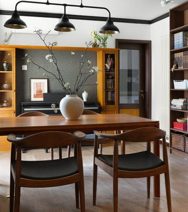 由于两个孩子都在读书,家里需要大量的藏书区域,所以将整面墙的书架设计为客厅不仅解决了收纳需求,也投射出孩子们在各个阶段的作品和奖杯,为空间投射出和谐、快乐的味道。