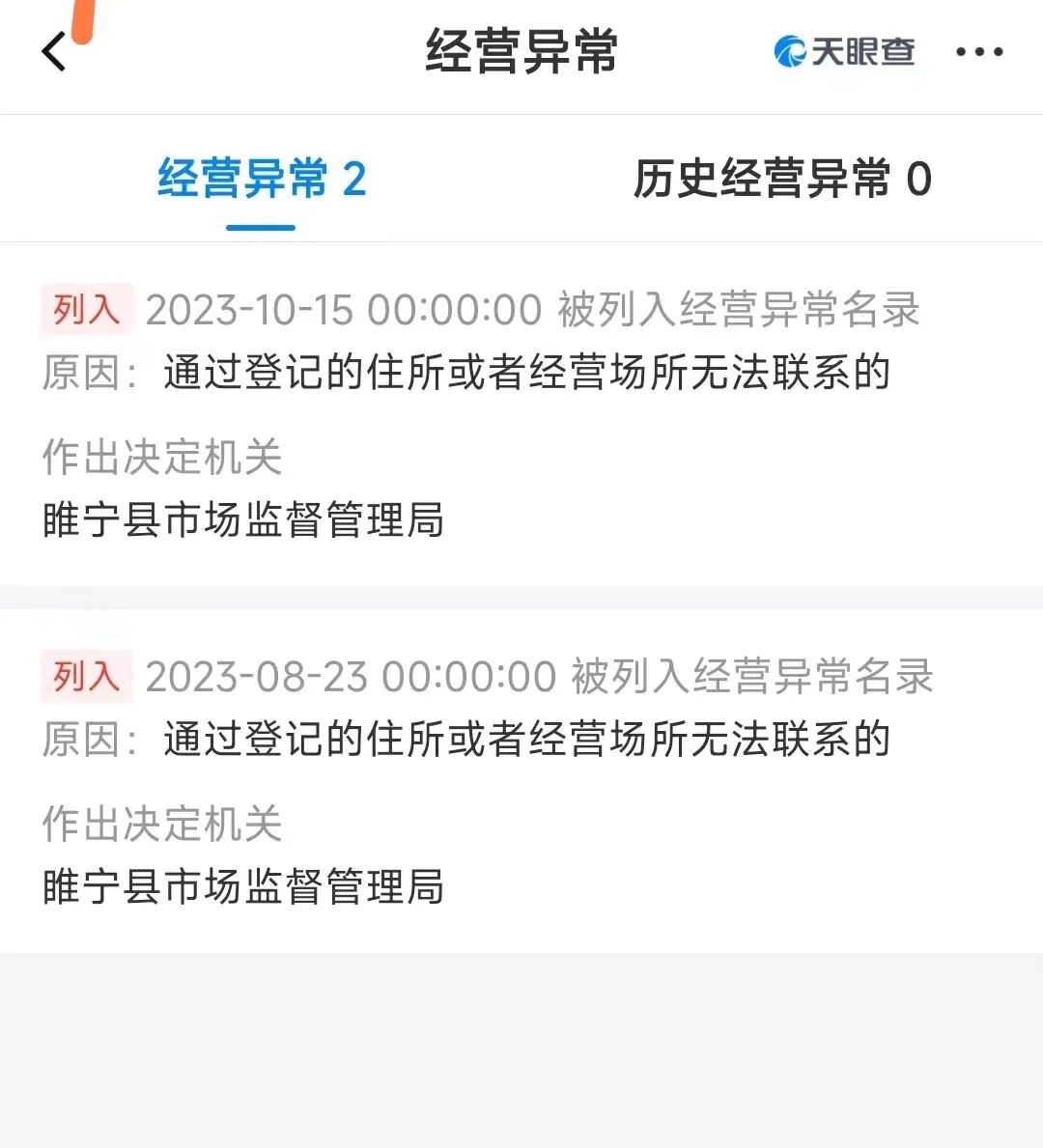 并被睢宁县市场监督管理局于2023年8月和2023年10月两次列入经营异常名录