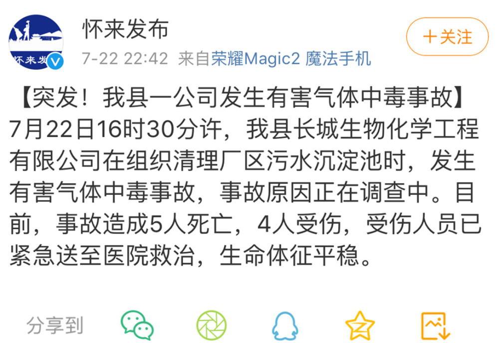 7月22日晚,据河北怀来县委宣传部通报,7月22日16时30分许,该县长城生物化学工程有限公司在组织清理厂区污水沉淀池时,发生有害气体中毒事故,事故原因正在调查中。