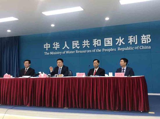 水利部副部长兼应急管理部副部长叶建春(左二)在发布会上答记者问。澎湃新闻记者 刁凡超 图