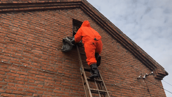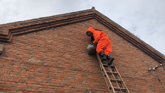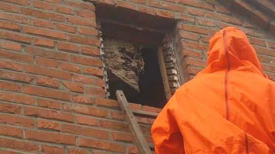 村民介绍说,今年夏天的时候发现家里有少量马蜂进进出出,也没在意,最近发现马蜂越来越多,早上看见有很多马蜂在通风口飞来飞去,找梯子上去看,发现原来是一个巨大的蜂窝,把通风口都给堵死了。