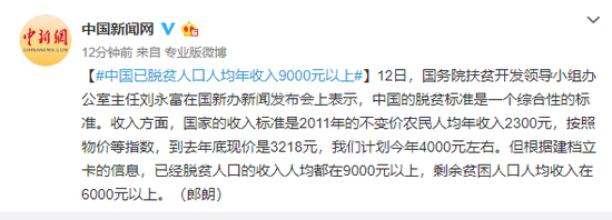 12日,国务院扶贫开发领导小组办公室主任刘永富在国新办新闻发布会上表示,中国的脱贫标准是一个综合性的标准。收入方面,国家的收入标准是2011年的不变价农民人均年收入2300元,按照物价等指数,到去年底现价是3218元,我们计划今年4000元左右。但根据建档立卡的信息,已经脱贫人口的收入人均都在9000元以上,剩余贫困人口人均收入在6000元以上。(郎朗)