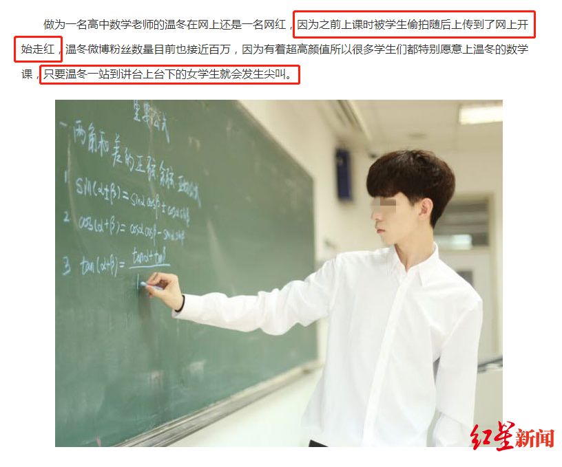 红星新闻记者注意到,这组“课堂”照片也发布在温冬的个人微博并被置顶,总共有9张,照片分别有板书状、手指学生点名状、手指黑板讲解状等日常上课的场景。但随后多名网友指出,温冬的“课堂照片”并非学生偷拍,而是疑似自行摆拍。