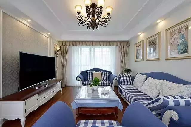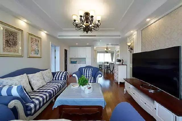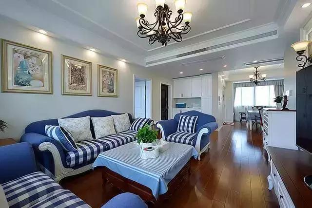 客厅摆放着一美式蓝色布艺沙发,搭配深的色木家具,显得格外优雅,沙发墙面用三幅挂画装饰,进行墙面点缀,增加美感。