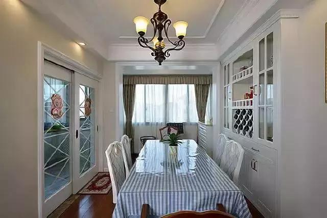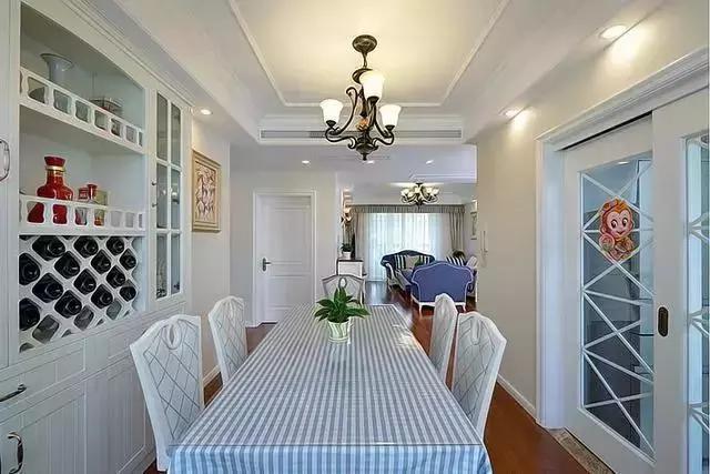 餐厅摆放的是四方桌,面上铺了一块桌布和钢化玻璃用来保护桌面,桌布的颜色让人感觉非常清爽,墙面装了个餐边柜+酒柜的设计,简洁实用设计感强。