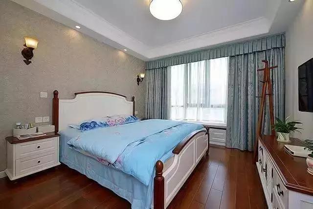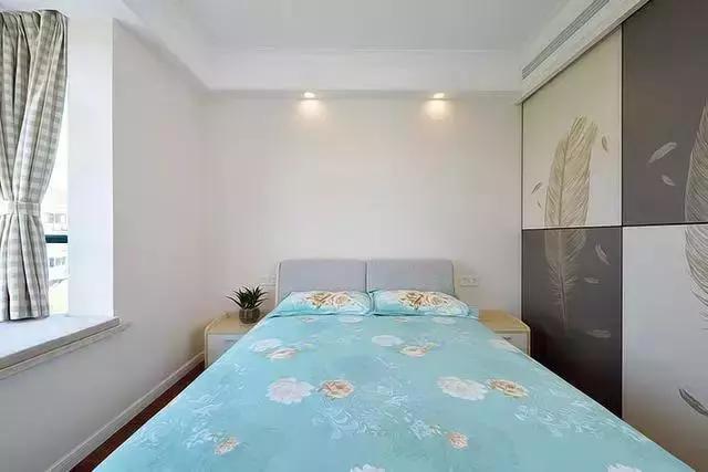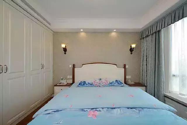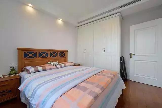 主卧的衣柜安装了白色对开门,简洁大方,收纳强,一张床铺搭配两个床头柜,结合床头壁灯,形成一个对称美。