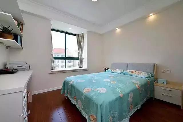 卧室的布置简洁实用,床尾放着一个带有收纳功能的电视柜,方便放些小物品,飘窗被改装成储物柜,让空间得到了充分利用。