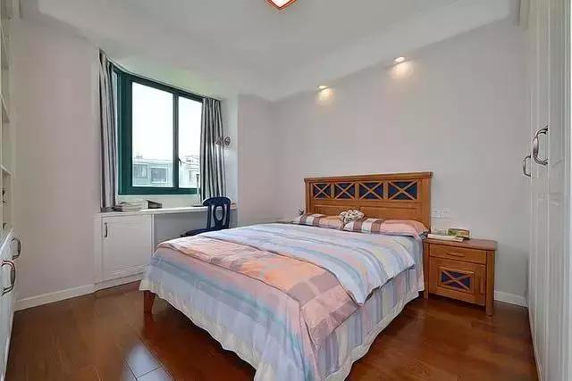 老人房摆放的是实木床,颜色深了点,显得更加沉稳,白色的衣柜搭配黑色拉手,简单大方。