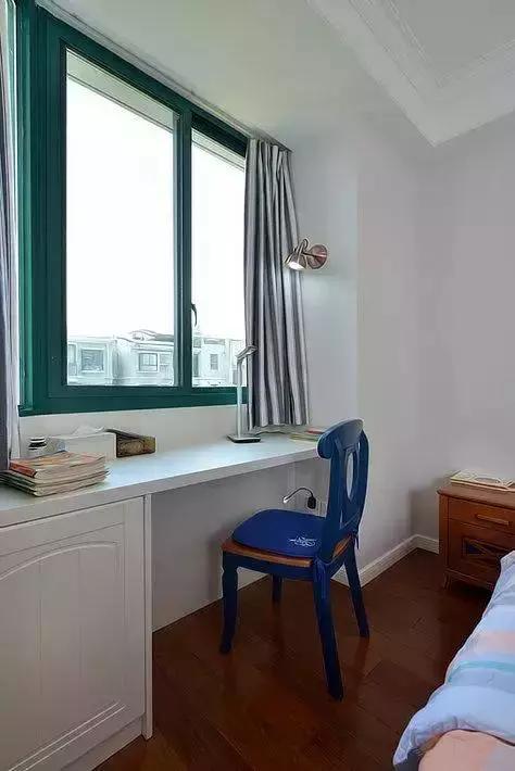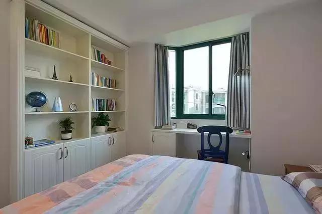 床尾装了个半开放式的书架,可以用来放书、放装饰品,及收纳物品,另外在窗户前装了个简易的书桌,方便看书写字。