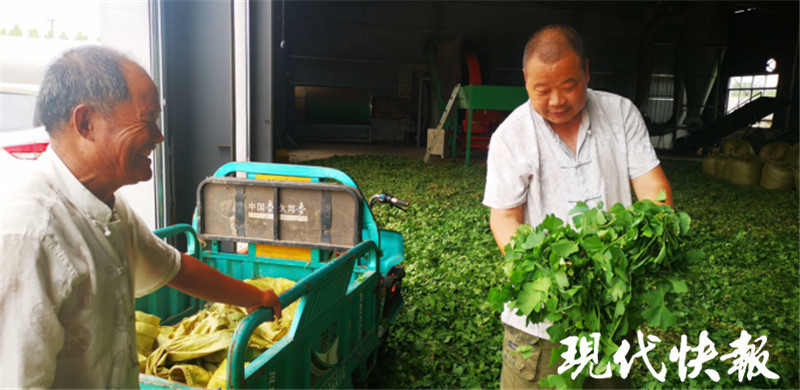 质量提高之余,为让村民们的银杏叶卖个好价钱,除了技术指导外,公司还提供统一的购销服务。在公司集中收购点,农户将刚刚采摘的银杏叶拉到这里集中售卖。在过磅之后,村民们当场就拿到了钱,高于市场价格的保护价,大大降低了市场变动对农户的风险影响,让大家种起地来更有底气与动力。