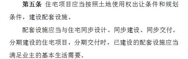 3、住宅项目应当按照土地使用权出让条件和规划条件,建设配套设施。配套设施应当与住宅同步设计、同步建设、同步交付。