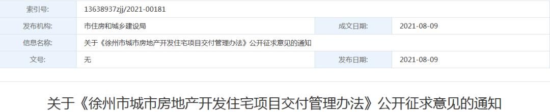 昨日,徐州市住房和城乡建设局发布了关于《徐州市城市房地产开发住宅项目交付管理办法》公开征求意见的通知。