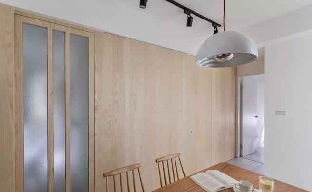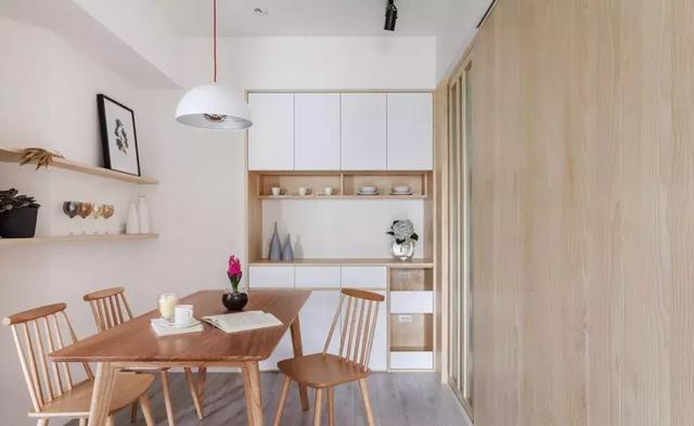 餐厅大部分使用原木色+白色,打造出了一个温暖干净的餐厅空间。墙上增加了隔板,在增加收纳的同时也让原木色的元素扩展到了干净的大白墙中,融合却不突兀,这里能摆放上一些绿植或者装饰物,让餐厅空间变得更加温馨热闹。