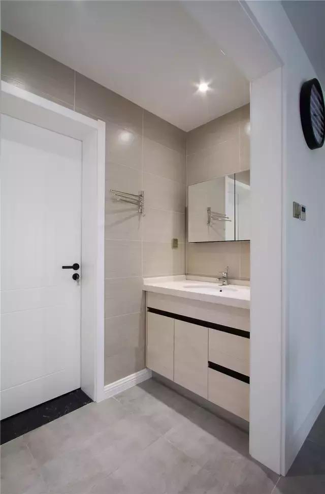 卫生间打造干湿分离,洗手台和淋浴间使用了玻璃推门进行隔断,透亮且实用。