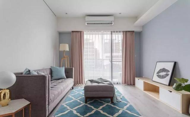 客厅中使用了大量的木纹元素,旨在提升家居空间的温度和润度。浅蓝色的壁布打造的电视墙和地面上铺设的蓝色格纹地毯互相呼应。容错率极高的灰色布艺沙发、单椅让空间增加了层次,也提升了原木风的包容魅力。