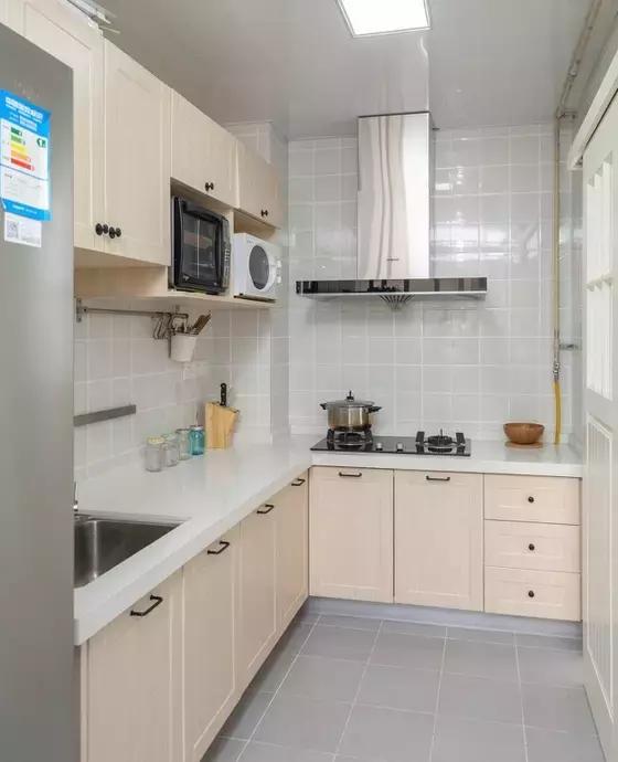 厨房的整体与厨房相似,各类厨房电器直接安排到橱柜中,各个家居用品有条不紊,各自在自己的角落默默守着家中的烟火气。家电安排进橱柜也让原本杂、乱的厨房变得干净清爽了许多。