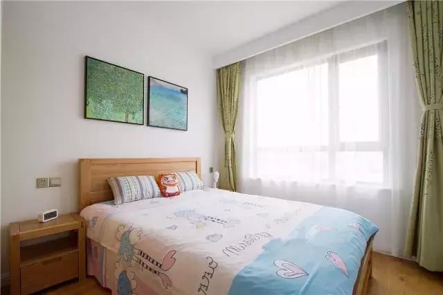 次卧作为孩子的房间,使用了纯棉质感的床品,这里原木+纯棉打造出了一个自然舒适的环境,仿佛孩子的世界就该如此,远离一切的喧嚣,安静却美好。