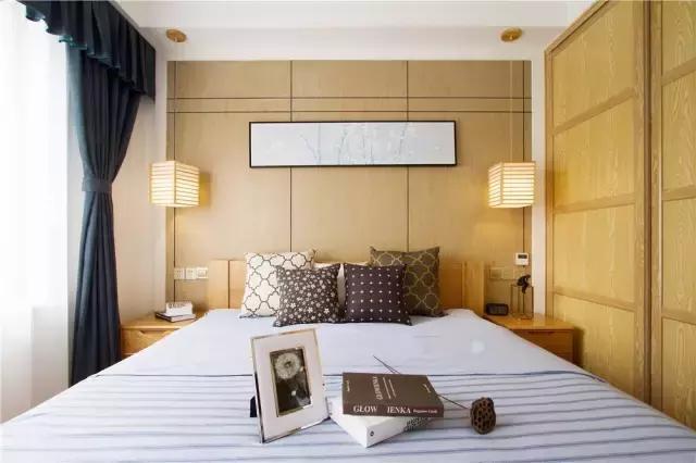 主卧一眼看去简单且朴素,背景墙使用了一个长方形的装饰画,没有过多的造型和装饰,配合着两边日式的吊灯,整个空间都显得朴实无华,却又温暖干净。