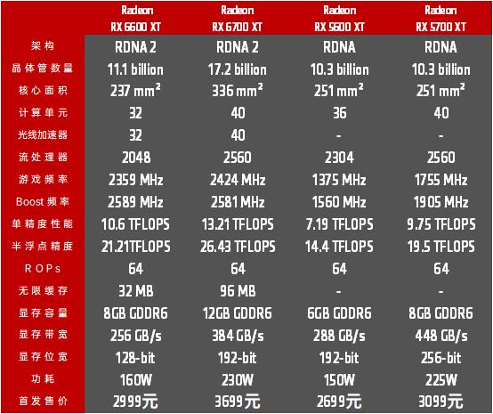 和更高端的RX 6700 XT相比,RX 6600 XT启用了新的小核心NAVI 23,核心面积只有RX 6700 XT采用的NAVI 22核心的三分之二。规格方面,其配备了32组计算单元,比RX 6700 XT少了20%,流处理器为2048个,光线加速器也同步缩减到了32个。