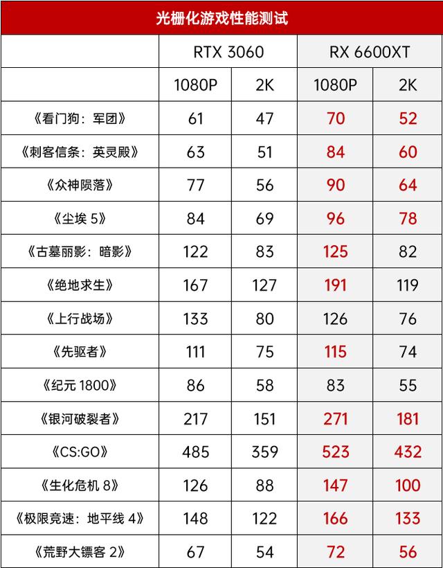 在《刺客信条:英灵殿》《众神陨落》《银河破裂者》等AMD优化的游戏中,RX 6600 XT不论是在1080P还是2K分辨率下都达到了14%以上的帧率优势,《众神陨落》1080P、2K的领先幅度分别为33%和18%,1080P分辨下的表现非常强。而在一些早期发布的游戏或者N卡优化游戏中,RTX 3060又表现出了少许优势,例如《古墓丽影》《先驱者》《绝地求生》在2K分辨率下就能略微小胜RX 6600 XT,新游戏方面,RTX 3060在《生化变种》《上行战场》这样针对N卡深度优化的游戏中也有小幅的优势。