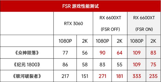 从测试的表现来看,开启FSR功能之后的帧率提升确实很明显,RX 6600 XT的平均帧率提高了20%以上,而且2K分辨率下的提升幅度要大于1080P分辨率。《纪元1800》在开启FSR之后2K分辨率下的提升幅度高达36%,“超级质量模式”下的画质其实也和原生分辨率差别不大,好处是换来了60fps以上的帧率表现。《众神陨落》和《银河破裂者》1080P下的帧率在开启FSR之后分别达到了109fps、333fps。