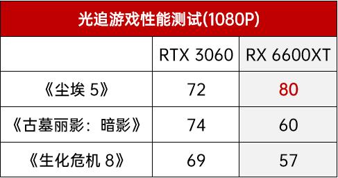 一开始我们通过3DMARK的基准测试就已经了解到了RX 6600 XT的光追性能水平,因此在接下来的光追游戏测试中,我们只重点考查其在1080P分辨率下的光追性能表现。总体来看,RX 6600 XT的光追性能还是符合其定位的,在《尘埃5》里甚至还能反超RTX 3060。