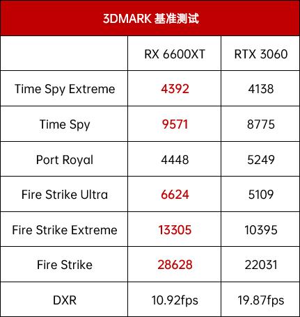 而光追性能方面,从之前的测试中我们就知道,这一代AMD显卡的性能和NVIDIA还有较大差距,RX 6600 XT的表现也不例外。在针对光线追踪的Port Royal测试中,RX 6600 XT相比RTX 3060落后了15%,DXR光追测试的落后幅度稍大。根据3DMARK成绩来看,RX 6600 XT在传统的光栅渲染游戏中应该强于RTX 3060,而光追游戏RX 6600 XT则不是RTX 3060的对手。