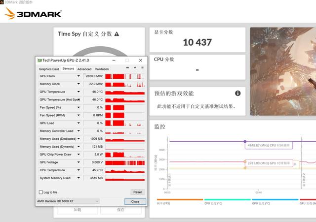 AMD这代显卡超频能力非常不错。在显卡驱动中,我们使用自动超频,驱动给出的频率为2719MHz。所以我们直接就把频率拉到了2750MHz,轻松跑过测试。最后我们这块卡可以稳定的跑在核心频率2830MHz/显存频率2150MHz上,TimeSPY的成绩从默认的9571直接暴涨近1000分达到了10437。