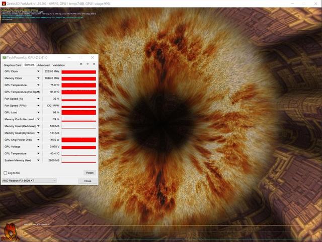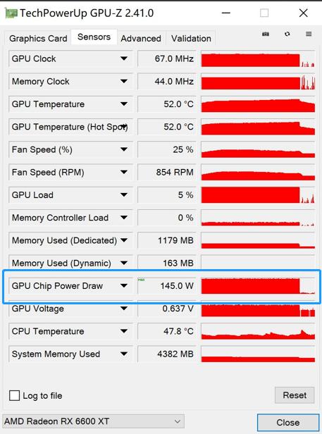 功耗方面,虽然RX 6600 XT的默认设计为160W,但XFX这块RX 6600 XT的FurMark考机功耗仅为145W,为了验证这一功耗表现,我们另外使用3DMARK TimeSpy的考机进行了测试,同样为145W。这样来看,RX 6600 XT不但在性能上超越了RTX 3060,同样在能耗比上也是大幅领先RTX 3060,A卡居然在这方面有优势,这在2年前的A卡上还是很难想象的,可以看出RDNA2架构确实有些过人之处。