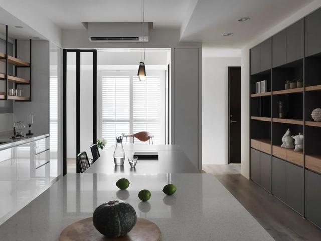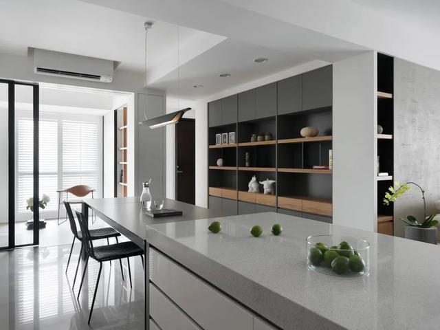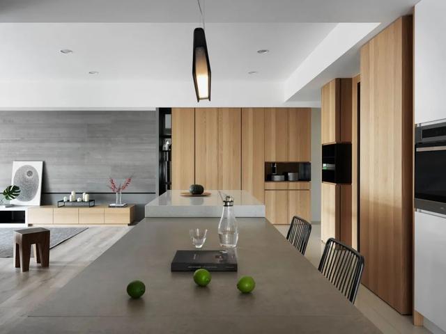 厨房区域布置了一张灰色台面的餐桌,旁边是一张白色大理石台面的中岛台,旁边是木制电器柜,整体空间显得简约自然,又温润大气。
