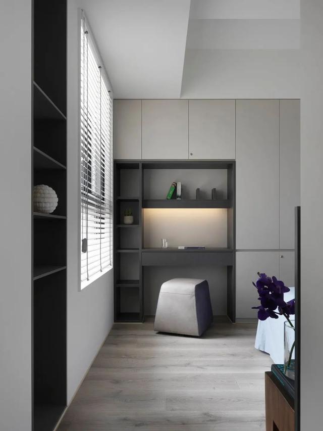 ,搭配上简约典雅的家具,时尚大方的现代空间与家具配合,高级水泥灰与百叶帘的细节搭配,让空间充满年轻时尚的个性与大方气质。
