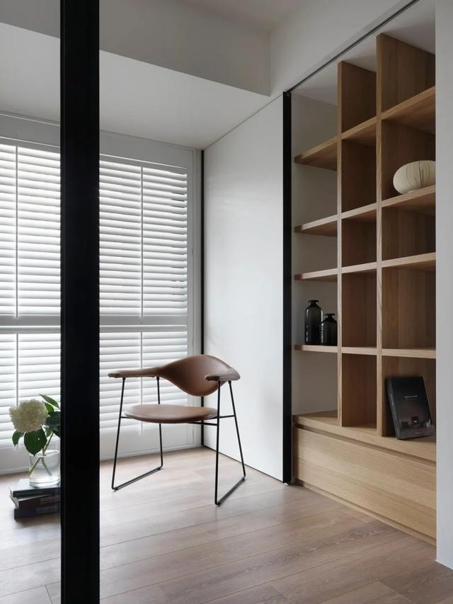 餐厅旁的小阳台,安装上推拉门后,隔开了一个小型休闲区,将休闲椅和书架摆放在一起,在百叶窗帘的装饰下,让整个空间充满轻松舒适的自然气息。