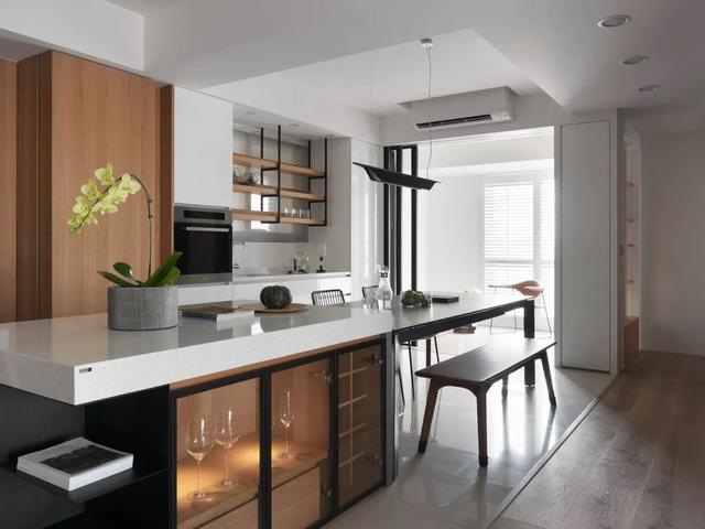 中岛台下方安装的玻璃门,内收酒杯与红酒架,收纳柜一眼就看出来的设计,也让空间显得更加时尚华丽有趣。