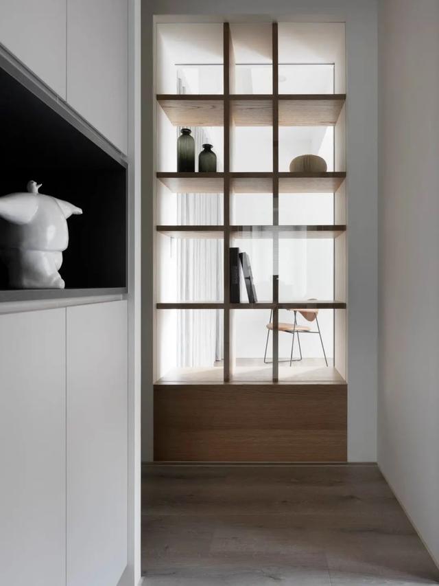 阳台后部与走廊相连,通透的书架分隔布局,使空间更具艺术性。