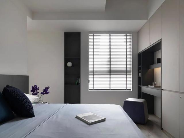 简约、自然的卧室空间,灰色的靠背设计,浅蓝色的床单,靠窗的一侧安装了开放式的书架收纳装置,结合百叶帘的窗户设计,使空间显得更加温馨舒适。