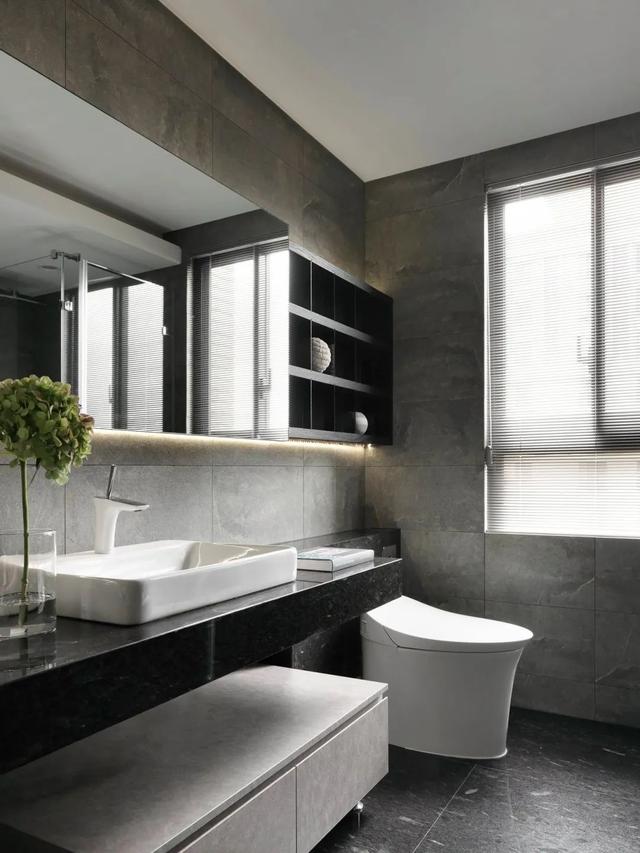 整个浴室是灰色的空间,配以黑色的洗手台面和台盆设计,同时洗手盆后面的镜柜也设计延伸到卫生间后面,让空间收纳更具实用性和便利性。