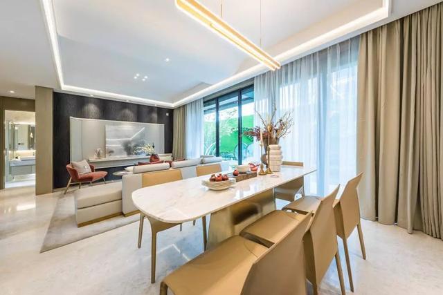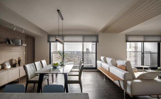 如果没有风水上的禁忌,这是最常见的设计方法,根据沙发的位置来分隔空间。沙发居中,餐桌椅直接布置在沙发后面,这也是横厅户型中常见的布局方案。