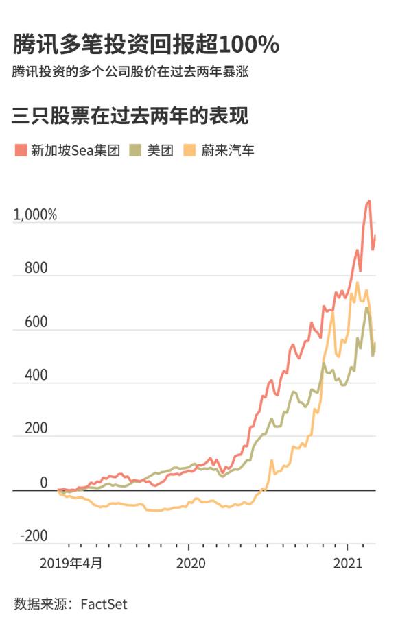 腾讯控股还在游戏、社交媒体、娱乐和电动汽车等领域的国内外初创公司上广泛押注。随着投资者们大量买入快速增长的科技公司的股票,抬高这类公司的股价,并热衷于打新(ipo),腾讯的这一策略已经获得了丰厚的回报。