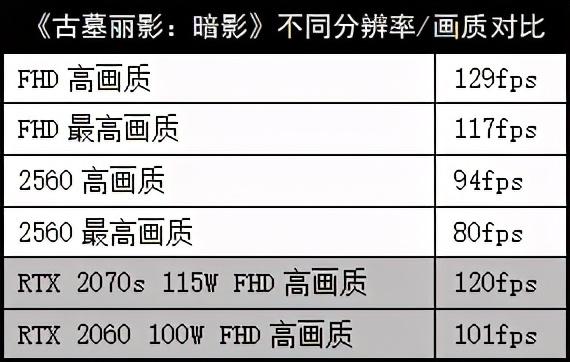 《古墓丽影:暗影》,2.5K分辨率的高画质和最高画质分别可以跑94fps和80fps。如果降低到FHD,高画质下甚至可以跑到129fps。而作为对比,X10Ti-S的RTX 2070Super 115W版也只有120fps,而100W的RTX 2060只能跑到101fps,RTX 3060领先28%!