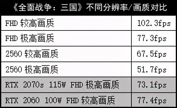 《全面战争:三国》也是一个差距拉得极大的游戏,2.5K分辨率下,钛钽Plus在较高画质下可以达到67.5fps;若降低分辨率至FHD,那么较高画质可飙到102.3fps,而对应的,RTX20系显卡也就70fps+,RTX 3060领先优势异常明显!