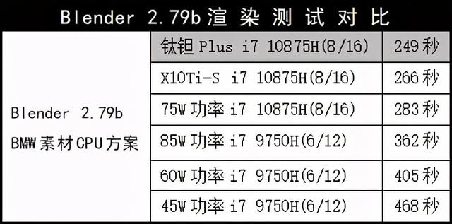Blender 2.79b渲染测试,BMW模板,处理器方案。这里对比了3颗i7 10875H,钛钽Plus的成绩也是最佳的(软件版本相同,都是2.79b)。而相对于6核处理器,它的效率更是秒杀!