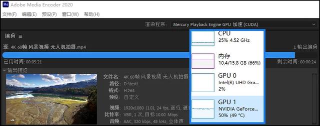 视频转码测试,将2.91GB的4K/60fps《无人机风景》转码为FHD/24fps,处理器方案(独显会辅助计算),耗时10分20秒;如果采用CUDA方案(本图),则时间缩短到5分46秒!而在4核处理器、6核处理器时代,这个视频转码通常要耗费20分钟、14分钟。
